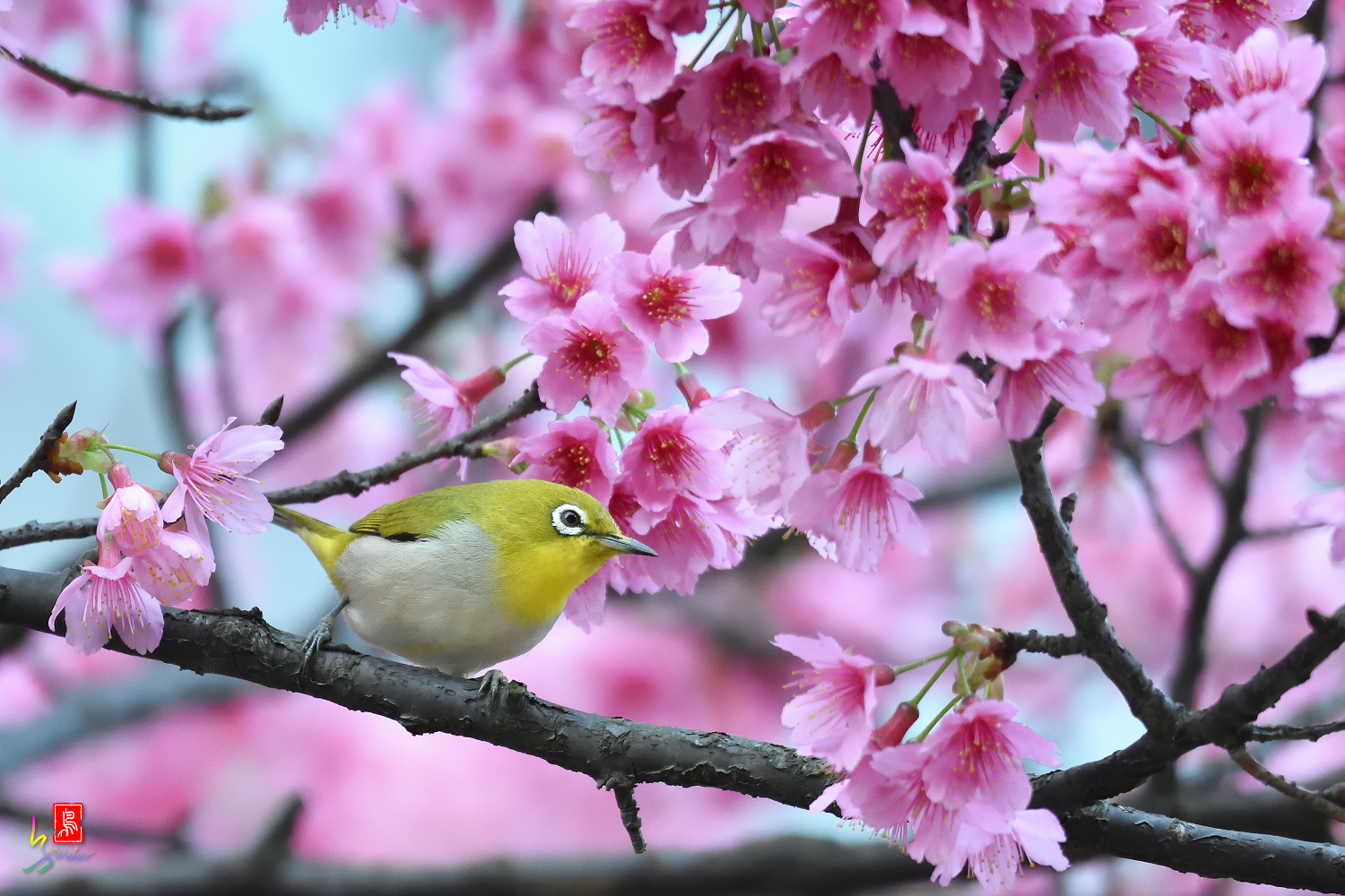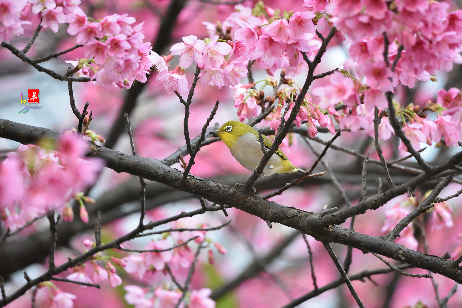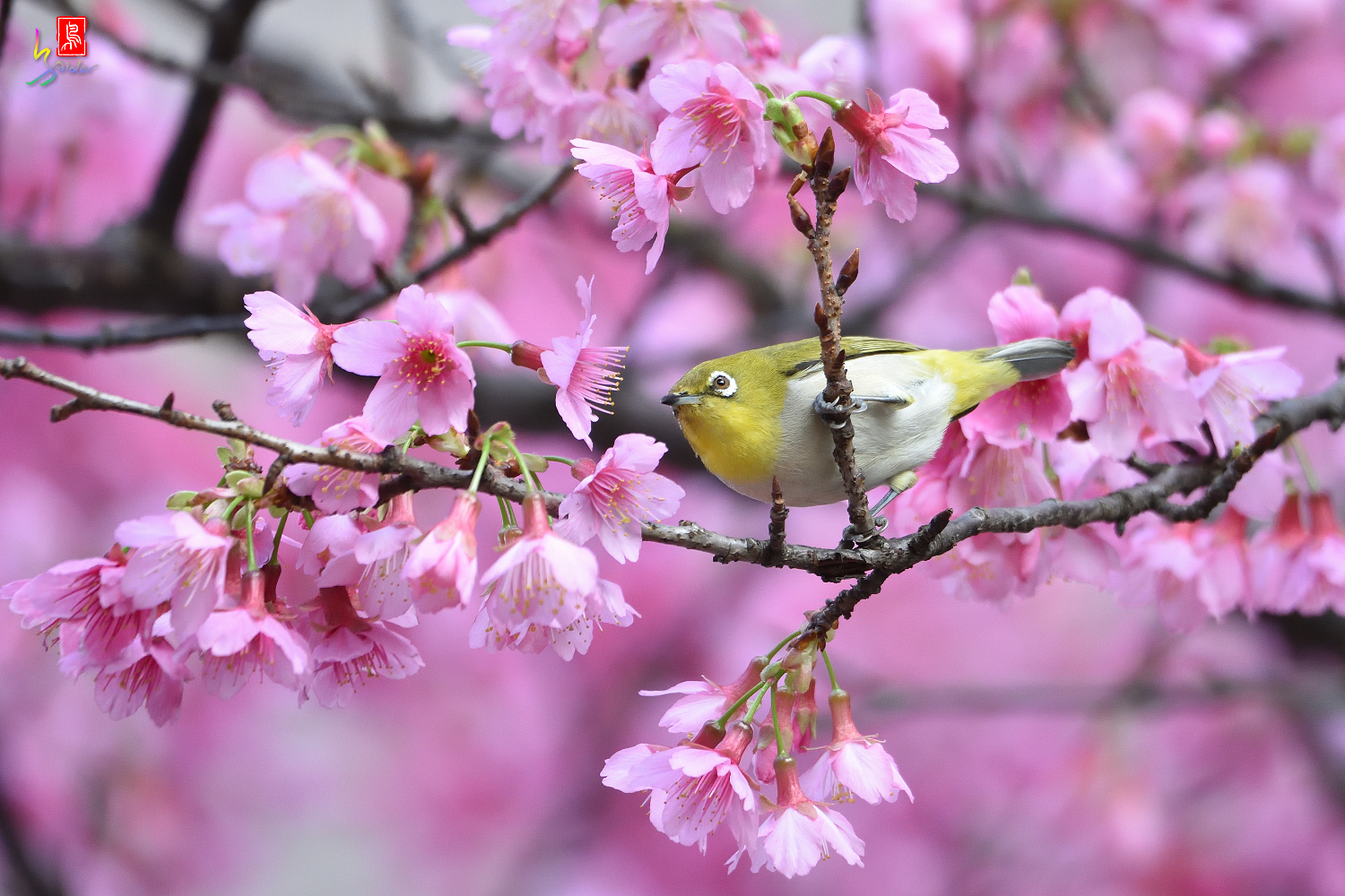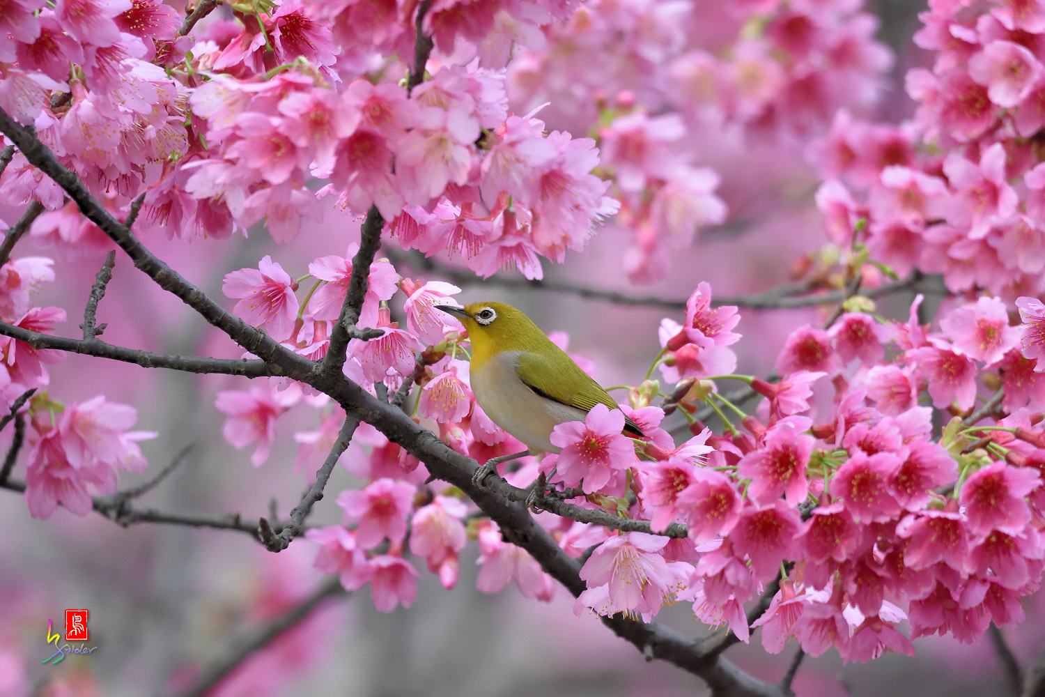 一直以來人云亦云地認為我所拍的櫻花綠繡眼是富士櫻(因為延平南路的花圃解說牌上是用這個名字),日前學長告知富士櫻的花期較晚而且花色偏淡,認為我所拍的應該是河津櫻,然後就上網查一查,品種名稱與實物都有些混亂,我所拍的可能應該叫「寒櫻」或「河津櫻」,再查wikipedia上的河津櫻,看不出有2色花的情形(不過wikipedia在選圖上常常有錯),目前認為叫它「寒櫻」可能比較適合(請參考網路文章:如何分辨櫻花品種?你追櫻了嗎?),以下就以「寒櫻」為名了。